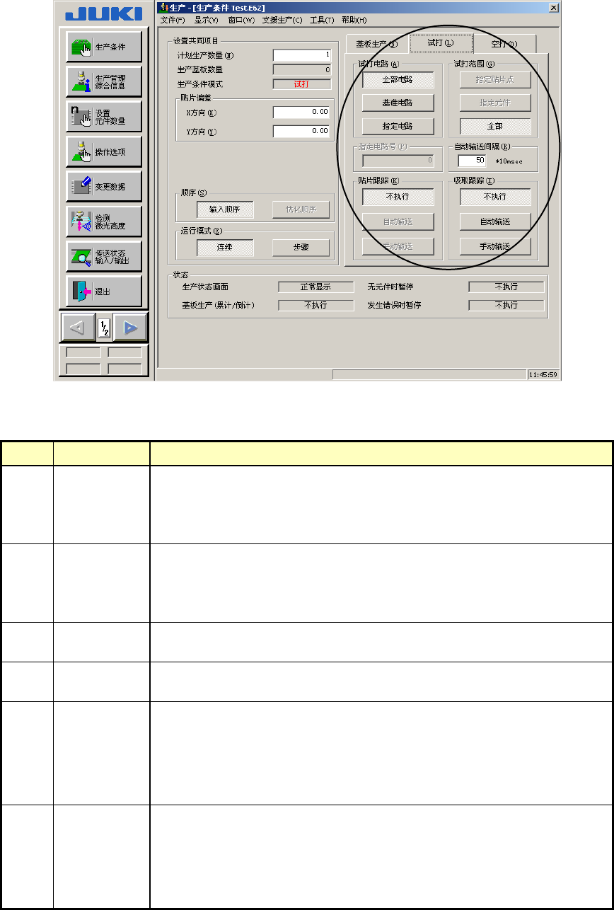 第 1 部 基本篇 第 2 章 生产 (2) 试打 图 2-8-2-2- 1 试打条件的设定 No. 项目 内容 1 试打电路 设置试打的电路。单面基板时不使用。 ·全部电路:对全部电路试打范围中设置的元件进行贴片。 ·基准电路:对基准电路试打范围中设置的元件进行贴片。 ·指定电路:对指定的电路试打范围中设置的元件进行贴片。 2 试打范围 设置试打范围。 ·指定贴片点:仅对贴片数据的试打项设置为进行的贴片点。 ·指定元件:元件数据的…