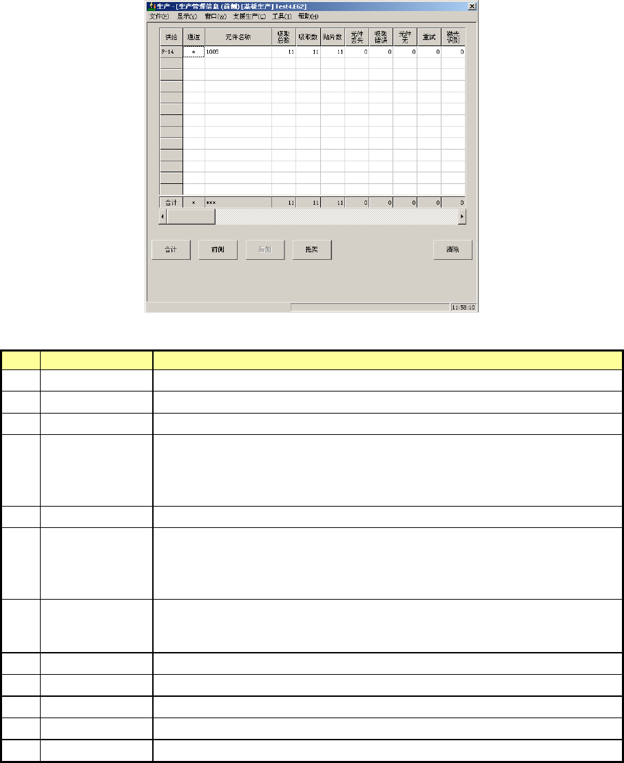 第 1 部 基本篇 第 2 章 生产 ② 各供给装置的管理信息 显示各供给装置的生产管理信息。 请从前面、后面、托架中选择。 选择前面时,会显示如下画面。 图 2-9-1- 3 生产管理信息 ( 前面 ) No. 项目 内容 1 吸取总数 该供给装置中进行吸取动作的次数。 2 吸取数 该供给装置中成功吸取元件的数量。 3 贴片数 从该供给装置吸取且贴片的元件数。 4 元件丢失 该供给装置中损失的元件数。 ( 吸取总数 - 重试 × …