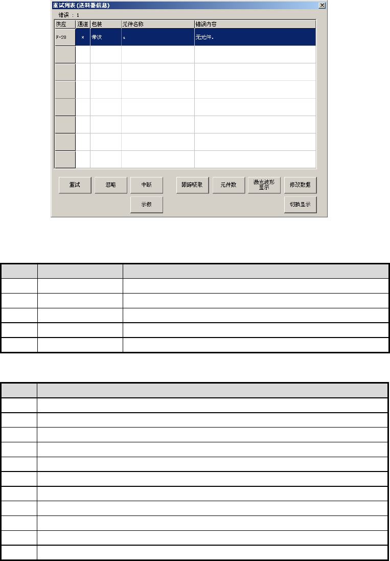 第 1 部 基本编 第 2 章 生产 2-10-4-2 生产中的重试列表显示 生产中的重试列表显示生产中发生的错误状态,显示如图 2- 10 -4-2-1 。 图 2- 10 -4-2- 1 重试列表 ( 供应装置信息 ) 的显示 从生产中的重试列表显示的情况中, 可以判断生产能否继续进行。 画面上的 7 个按钮, 可以 用来控制此后的生产状态。 注意 按下 <START> 开关后,贴片头会立即移动,开始生产。 为避免人身伤…