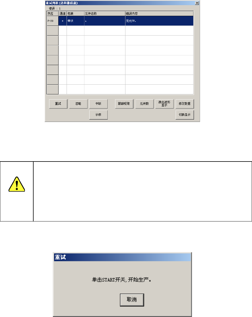 显示该信息时,若按下<START>开关,则从发生错误的元件贴片开始重新贴片,继续生产。
