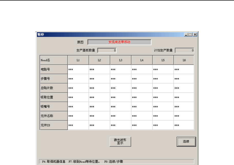 在生产运行中(XY轴移动中)检测出送料器悬浮时,会显示如下信息,并进入暂停状态。
