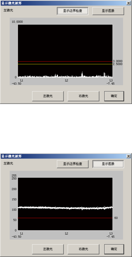 第 1 部 基本篇 第 2 章 生产 图 2-11-6- 2 边界检查显示 按下“左激光”按钮,可显示左激光的图像波形的结果。 按下“右激光”按钮,可显示右激光的图像波形的结果。 此时,按“显示图像”按钮,则可显示图像波形的结果。 图 2- 11 -6- 3 显示图像 2- 81