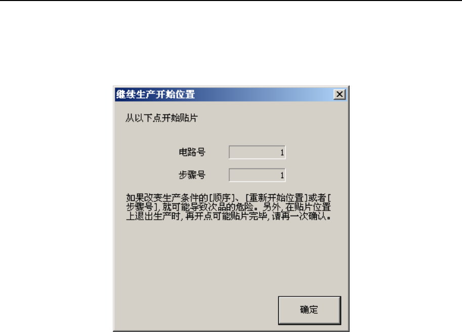 第 1 部 基本篇 第 2 章 生产 2-11-8 继续生产 当生产异常终止时 ( 发生非同步情况,生产 异常终止 ) ,可通过以下步 骤进行继续生产。 前提条件是:至少要有一个元件完成吸取、贴片操作后才可。 2-11-8-1 生产异常终止 在异常终止的错误信息对话框中,按下“确认”按钮后,可显示如下画面。 图 2-11-8-1- 1 开始继续生产的位置 在此按下“确定”按钮,则返回生产条件画面。 下一次生产开始时,将会询问 是否从上述…