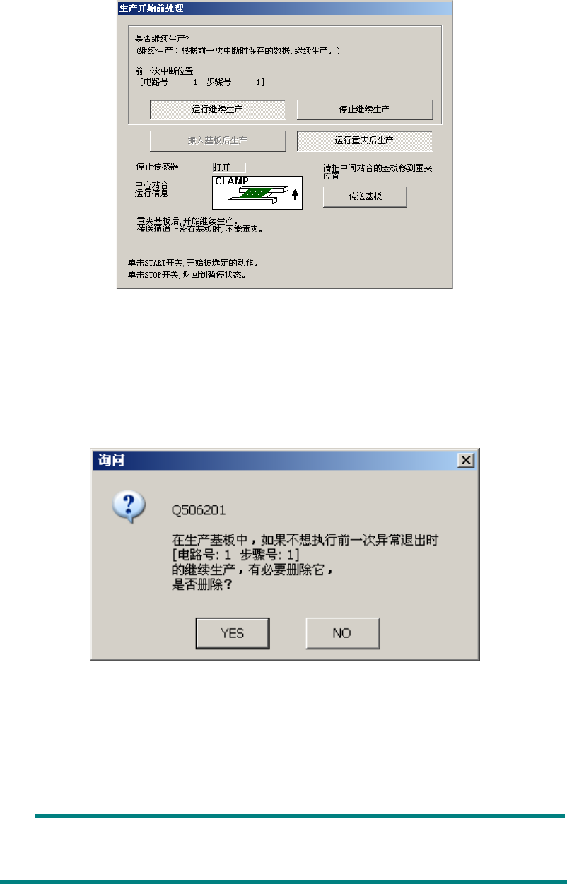 选择“YES”时,继续生产数据即被删除,不能执行上次异常终止时的“继续生产”。