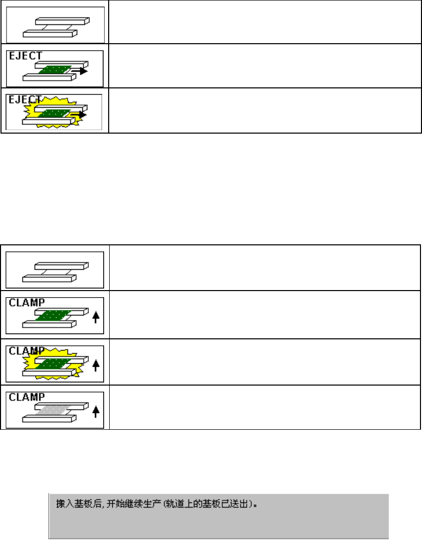 第 1 部 基本篇 第 2 章 生产 ① 选择“搬入基板后生产”时 用图像显示停止传感器获得的通道上的搬出站台的状态。 点击该图像,将在该站台上的基板安装到重夹位置。 传送道上没有基板。 从传送道上搬出基板。 生产中断时传送道上有基板, 但全部元件的贴片操作 已完成,需 要搬出。 从传送道上搬出基板。 但可能有缺件或误贴片,在搬出基板时需要充分注意。 ② 选择“运行重夹后生产”时 用图像显示停止传感器获得的传送道上的重夹站台的状态。 或…