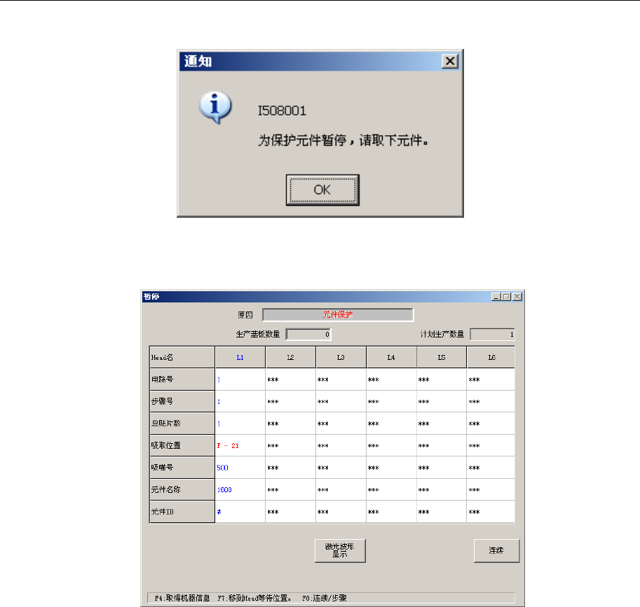 第 1 部 基本篇 第 2 章 生产 2-11-14 因元件保护导致的暂停 在生产程序的 “元件数据 ( 扩展 [ 附加 ] 信息 ) ” 中, 指定为元件保护的元件发生识别异常时, 则会进入暂停,显示如下画面。 图 2 - 11 -7- 1 元件保护暂停 请用手拆下元件后,选择“确定”按钮。此时会显示如下画面。 图 2 - 11 -7- 2 暂停 按下 <START> 开关:废弃元件后,重启生产。 按下 <STOP&…