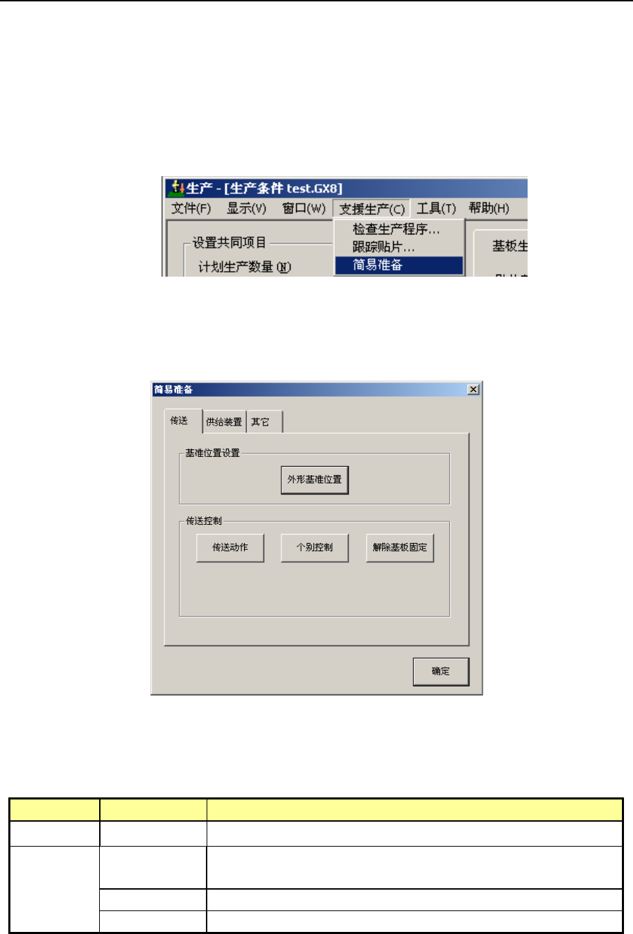 第 1 部 基本篇 第 2 章 生产 2-12-3 简易准备 简易准备功能,指的是可通过生产画面的菜单,选择生产 准备阶段的确认和调整,进行操 作,提高操作效率。 可操作的项目包括:确认吸取位置、进行传送微调、外形 基准位置的重新示教、贴片头退 避、开关 A TC 板等。 2-12-3-1 简易准备菜单 在菜单栏中选择“支援生产” - “简易准备”,则显示“简易准备”对话框。 简易准备对话框由“传送”、“供给装置”及“其他”标签构成。 …