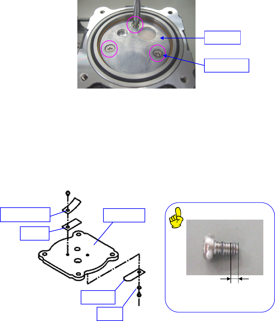 第 1 部 基本篇 第 3 章 维护 4 ) 安装了新防止吸气阀碰触胶垫的固定器放置在碗形密封垫圈之上, 使用涂抹了螺钉松动防止 剂 (NK - 4) 的平头小螺丝 (M4×8) ,用 3.0N ・ m 的力拧紧安装。 ※ 请按照密封材料更换步骤实施盖子的安装。在更换其它消耗部件时,在不关闭盖子状态下 参照个部位的更换工程项目。 吸气阀、排气阀的更换 1 ) 松开圆头螺钉 (M 3×5) ,按下并取下排气阀。 2 ) 擦干净泵头支架…