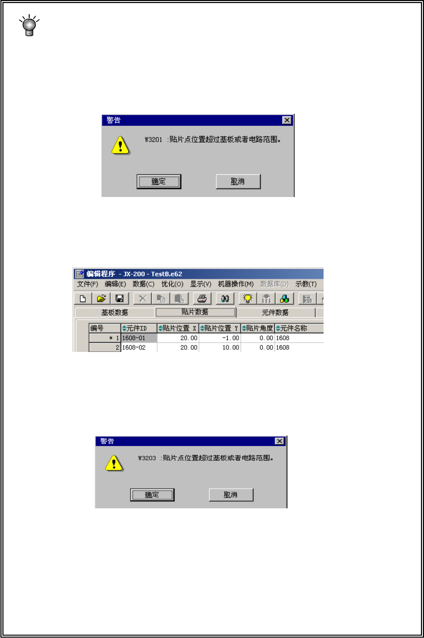 在输入贴片位置 X 或 Y 时,或分别对其进行了改变时,进行范围检查。