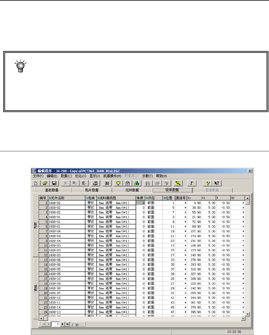 第 1 部 基本篇 第 4 章 制作生产程序 双击元件名、或点击画面左侧的“表格”标签,可打开以下的表格画面。 元件名、包装方式、供给装置,可分别显示在贴片数据及元件数据中输入的数值。 可在表格画面中对 “角度” 、 “供应”、 “位置”、 “通道号”、 “吸取坐标” 、 “状态” 6 个项目进行编辑。 图 4-3-6-1- 2 吸取数据 表格画面 例 ) 在前面配置 41 号。 (1) 表格画面中的操作 <1> 在表格画面…