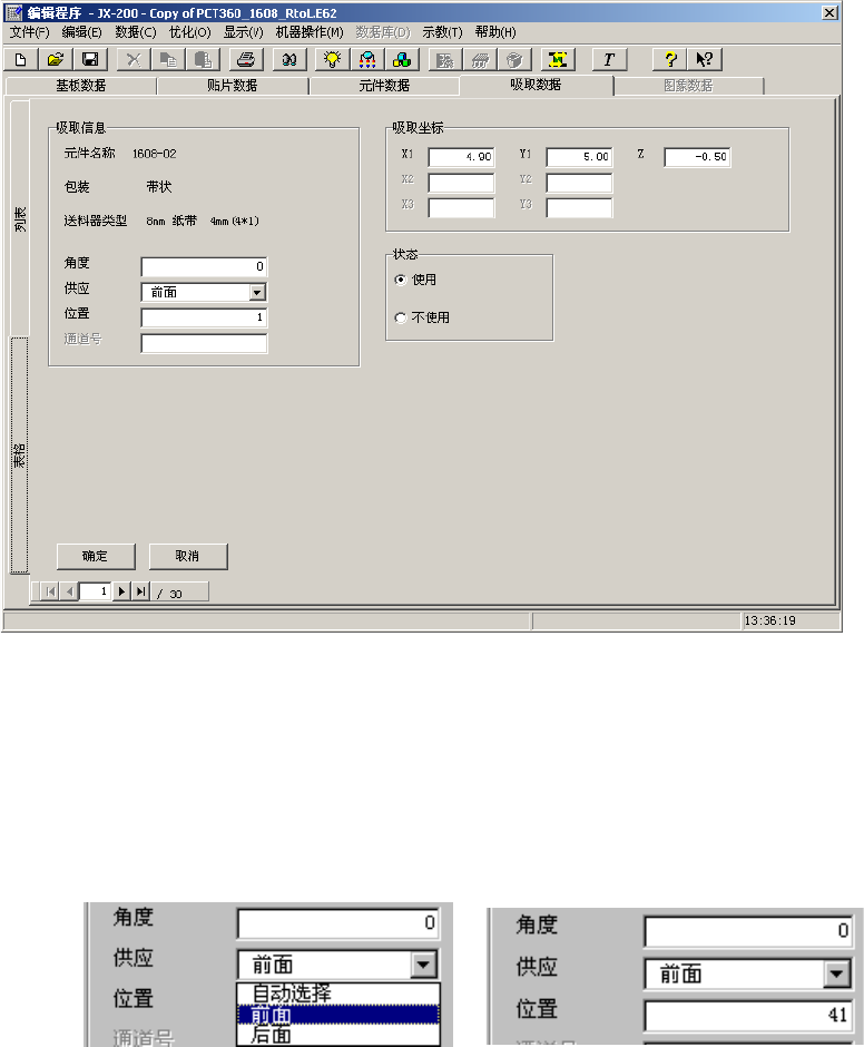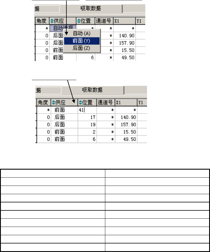 可在表格画面中对“角度”、“供应”、“位置”、“通道号”、“吸取坐标”、“状态”
