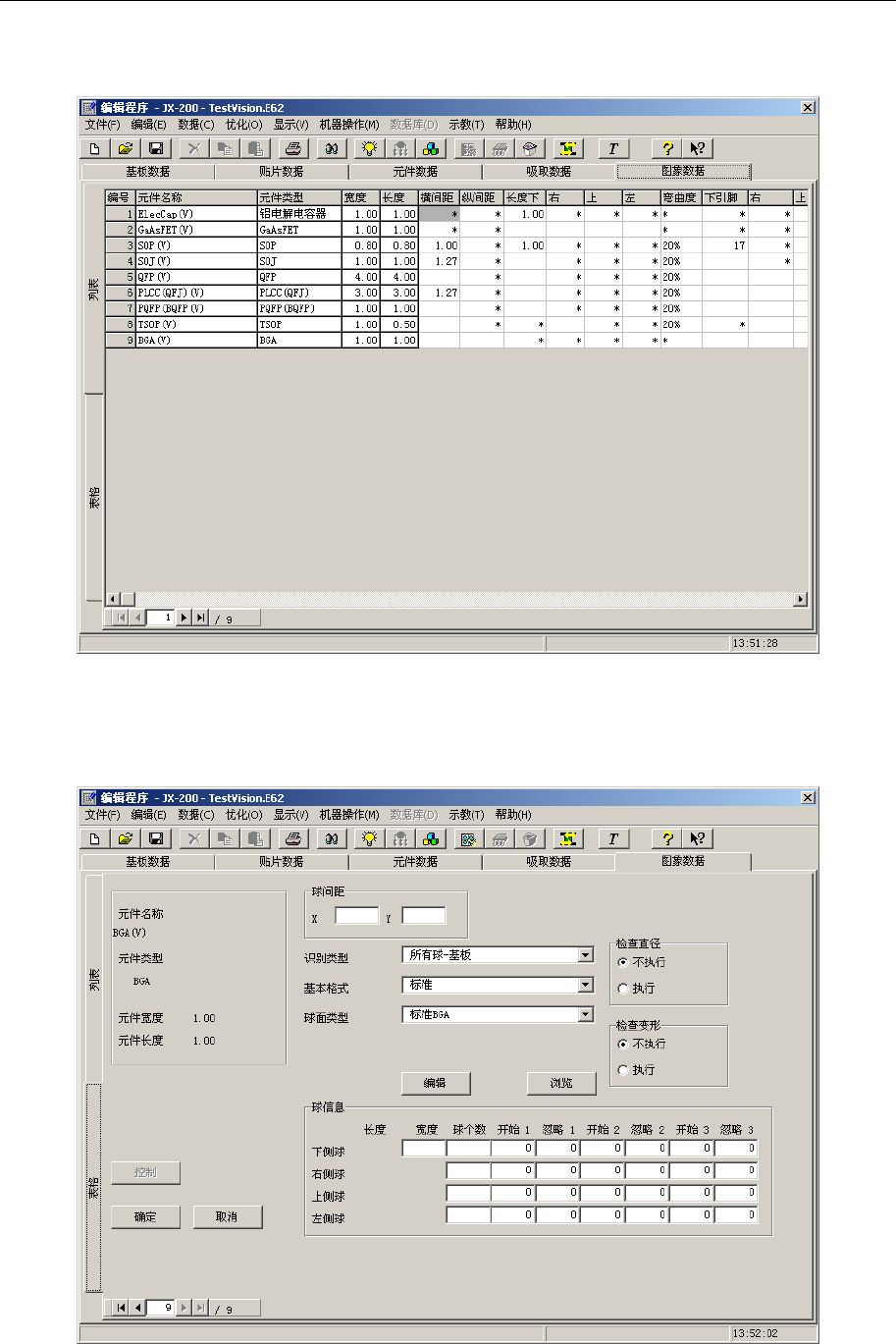 第 1 部 基本篇 第 4 章 制作生产程序 (2) 球面元件类 ( BGA 、 FBGA ) 表 4 -3-7-1-2- 2 设置范围 ( 球面元件 ) 元件种类 设置范围 引脚间距 mm ( 球间距 ) 引脚长度 mm ( 球直径 ) 引脚数 ( 个 ) ( 球数 ) BGA 0.35 - 3.0 0.4 - 1.0 4- 51 FBGA 0.25 - 3.0 0.1 - 0.63 4- 51 ( 注 1) 引脚 ( 球 ) 间距:…