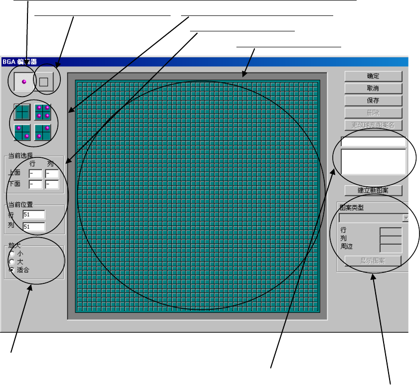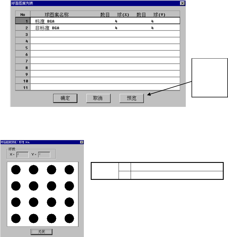 第 1 部 基本篇 第 4 章 制作生产程序 (1) 浏览 选择浏览后,可显示如下球面图案列表。 可双击所要设置的球面图案,或选择球面图案后按下“确定”按钮。 从数据库中调出球面图案时, 不能直接调出球面图案 , 而只能调出已设置了球面图案的元件 数据 ( 图像数据 ) 。 图 4 -3-7-3- 10 - 1 球面图案列表 ● 球面图案的预览对话框显示例 图 4 -3-7-3- 10 - 2 球面图案的预览显示例 球数 X 球的列数 …