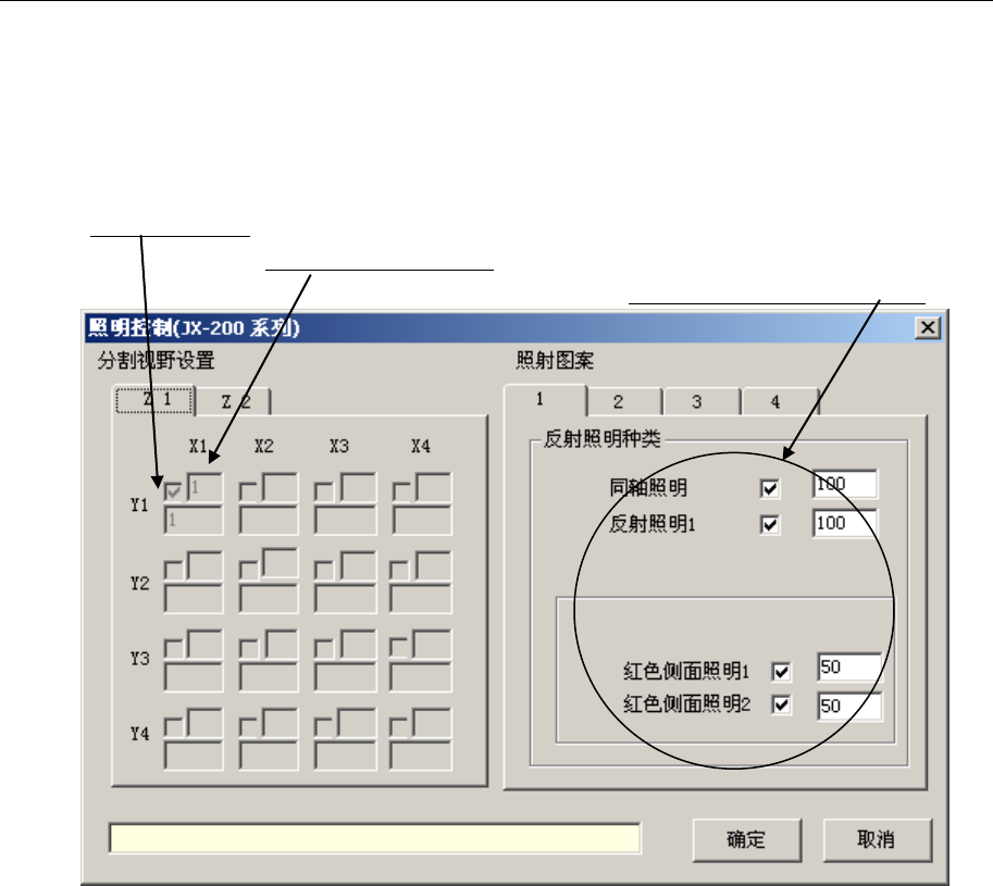第 1 部 基本篇 第 4 章 制作生产程序 4-3-7-6 照明控制 可指定用 VCS 识别时的照明控制 ( 下图为不进行分割识别时的例子 ) 。 ① 分割视野设置( JX - 200 不能使用分割识别) 在进行分割识别时,显示分割次数 ( 目前最大为 4 次 ) 。 “ Z2 ”现在没有使用。 照射图案的编号 ( 有多个照射图案时,指定其 编号 ) 。 分割识别时的识别顺序 。 画面显示因照明种类而不同。 图 4-3-7-6-1 照…