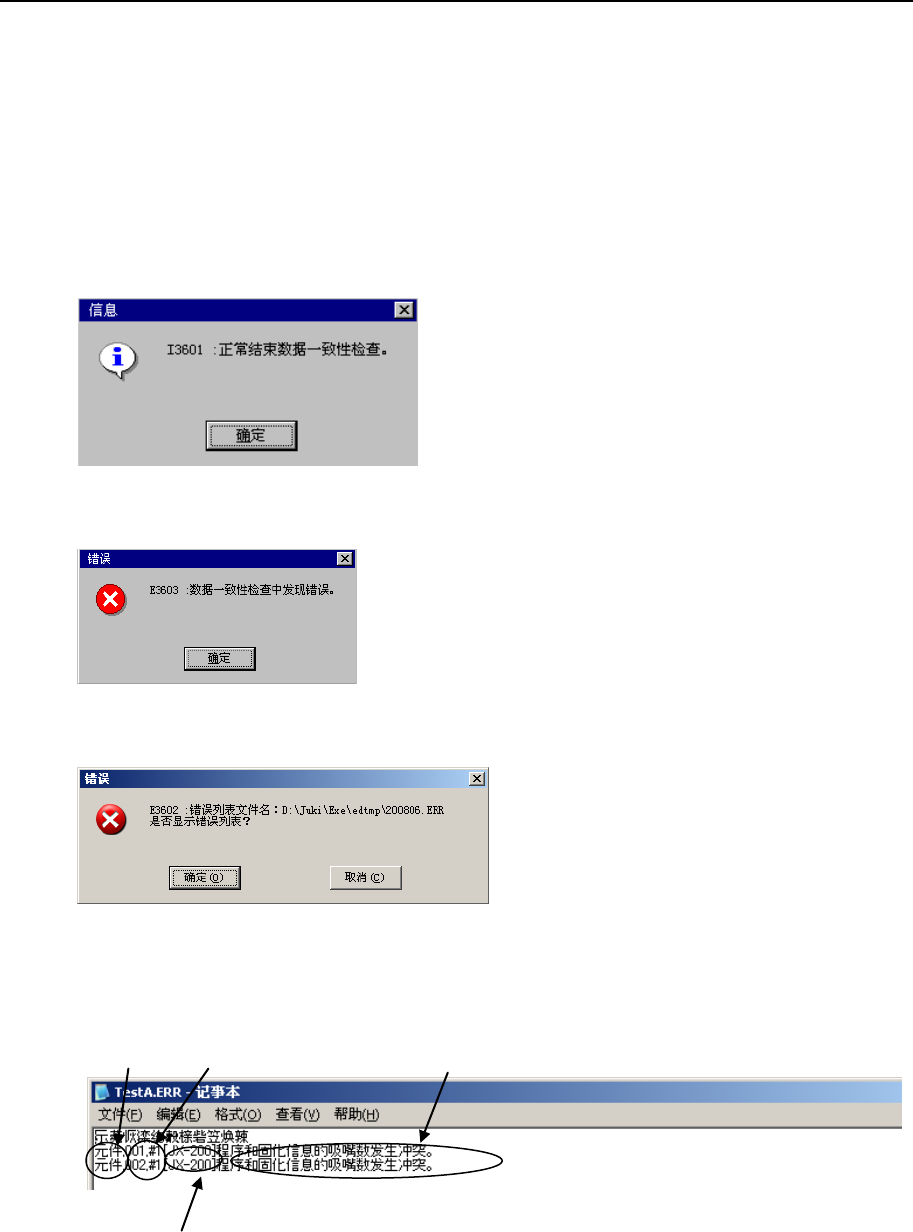 第 1 部 基本篇 第 4 章 制作生产程序 4-3-9 数据一致性检查 检查已制作的程序和机器设置中的设置内容是否矛盾,并检查程序本身是否矛盾。 一致性检查结束后, 即可进行优化。 当检查结果显示有错误发生时, 则显示错误内容。 此时, 请参考显示内容,修改程序或“机器设置”。 (1) 执行一致性检查 从菜单栏中选择“数据 (D) ” / “数据一致性检查 (L) ”,执行一致性检查。 (2) 检查的结果报告 进行一致性检查后,显示如…