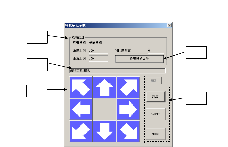 第 1 部 基本篇 第 4 章 制作生产程序 4-5-2-6 OCC 坏板标记示教 有关 O CC 坏板标记示教操作的详情,请参见 6-5-8 章。 图 4-5-2-6-1 OCC 坏板标记示教 ①照明信息 显示当前设置的照明设置。 ②信息 显示信息。(例如,「请指定检出框」等) ③移动按钮 移动监视器里显示的检出框。 ④设置照明条件按钮 显示照明条件设置对话框,对照明条件进行设置。 ⑤[ FAST ]按钮 在选择此按钮的状态下按移动按…