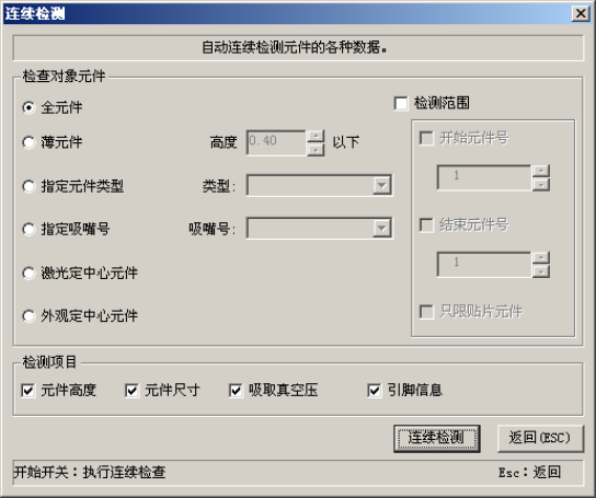 第 1 部 基本篇 第 4 章 制作生产程序 3) 连续检测 检测所有指定的元件。 ① 设置连续检测条件 从菜单栏中选择“机器操作” / “测量” / “连续检测”,则显示如下画面。 图 4-5-4-2 - 10 设置连续检测条件 a) 检查对象元件 设置对元件数据中有某一条件一致的元件进行测量。 ● 全元件 检测所有的元件数据。 ● 薄元件 仅检测元件高度在设定尺寸以下的元件。 ● 指定元件类型 仅检测指定的元件类别。 ● 指定吸嘴号…