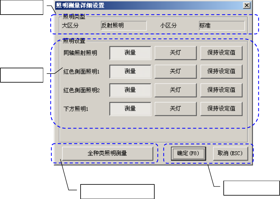 第 1 部 基本篇 第 4 章 制作生产程序 2) 照明测量详细设置 对照明项目进行个别设置 , 取得最佳照明条件 . 图 4-5-4-3-4- 3 照明测量详细设置对话框 ① 照明类型: 显示照明数据里设置的照明大、小区分。 ② 照明设置: 显示照明区分列表, 每项照明都配有 [ 测量 ] 、 [ 关灯 ] 、 [ 保持设定值 ] ( 以 下 简称 [ 保持 ] 按钮 ) 按钮。 [ 测量 ] 、 [ 关灯 ] 、 [ 保持 ] 三个…
