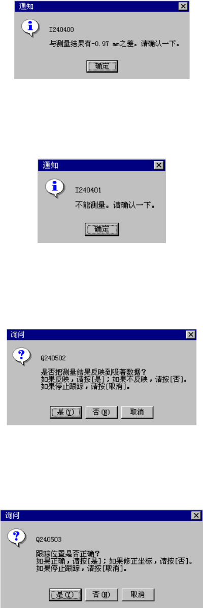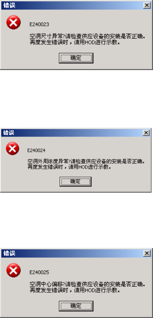 第 1 部 基本篇 第 4 章 制作生产程序 7) 跟踪时的自动示教 跟踪暂停时,可进行自动示教。 自动示教时,会出现下列 5 种错误 / 询问。 ①尺寸异常时 空洞指的是,安装元件的凹进部分。空洞尺寸与元 件尺寸相比显得异常时,会显示如 下错误提示。 ②浓度异常时 空洞影子浓度异常时,会显示如下错误提示。 ③ 空洞中心偏移时 设定的吸取数据与自动示教矫正的吸取数据差距过大时,显示如下错误提示。 4- 226