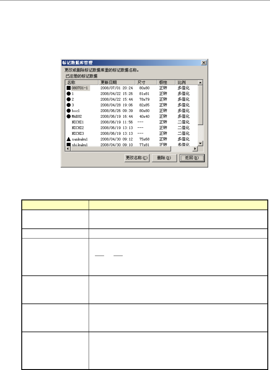 第 1 部 基本篇 第 4 章 制作生产程序 4-5-4-5 管理 对用“示教”进行标记数据示教时所注册的标记数据的数据库文件 , 进行各种管理。 使用镀锡照明 ( 选购项 ) 制作的标记数据也可注册。 ( 1 ) 管理:标记数据库 对标记数据示教时所注册的标记数据的数据库文件 , 进行各种管理。 从菜单栏中选择“机器操作” / “管理” / “管理” / “标记数据库”,显示如下画面。 图 4-5-4-5 - 1 标记数据库管理 1)…