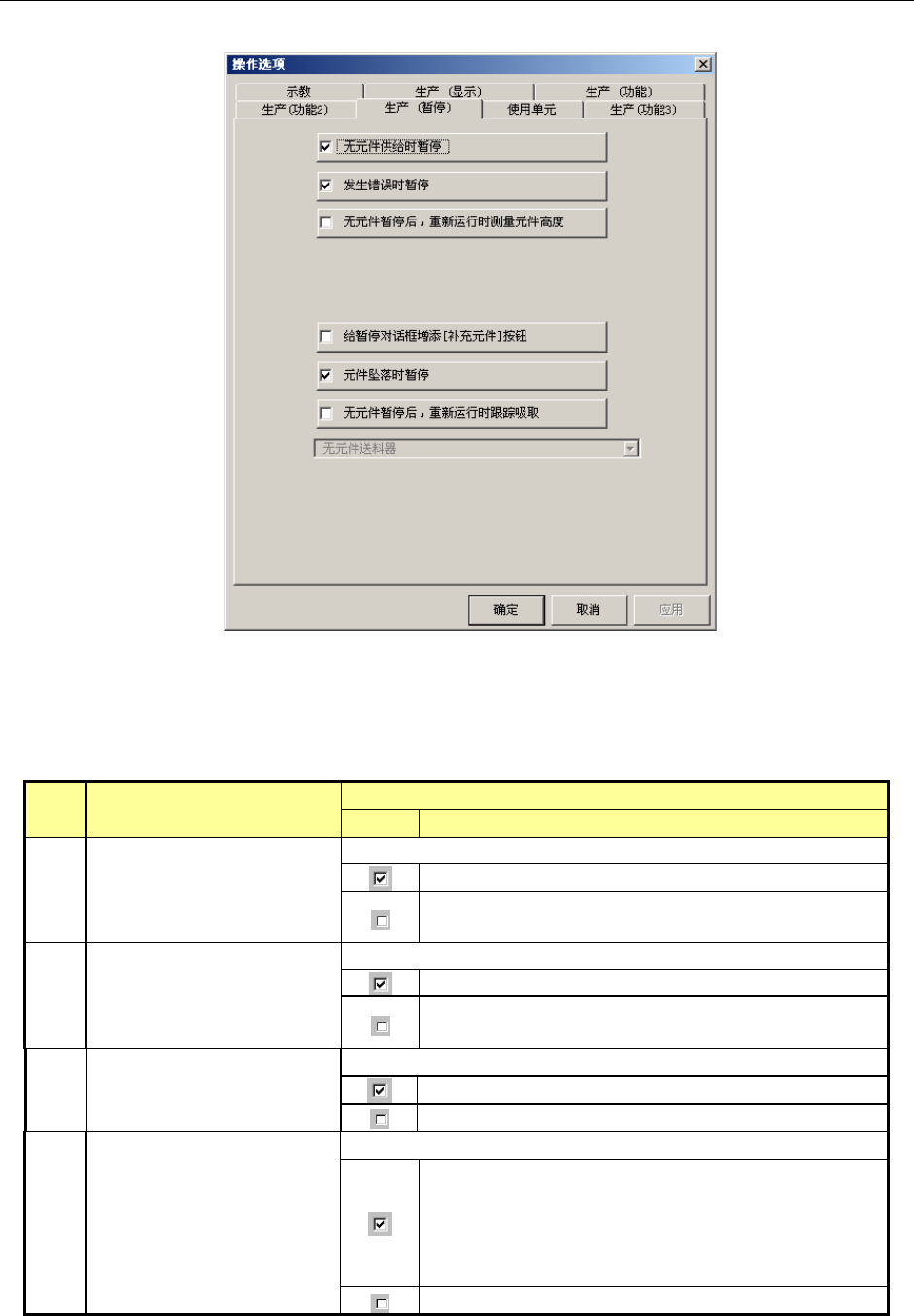 第 2 部 功能详细编 第 5 章 操作选项 5-2-5 生产时的暂停选项设置 设置生产时的动作。 图 5-2-5 生产时的暂停选项 表 5-2- 5 生产中暂停设置项目的细节和内容 序号 项目 内容 状态 动作及详细内容 1 无元件供给时暂停 设置发生元件用尽时的动作模式。 元件用尽时,暂停生产。 生产中即使发生元件用尽,只要有可贴片的元件,即 继续生产。 2 发生错误时暂停 设置出错时的动作模式。 生产动作发生错误 ( 包括元件用尽…