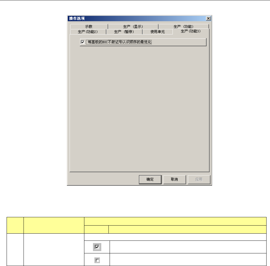 第 2 部 功能详细编 第 5 章 操作选项 5-2-7 生产的功能 3 选项的设置 设置生产时的动作。 图 5-2- 7 生产功能 3 选项 表 5-2- 7 生产(功能 3 )选项的设置项目及内容 No. 项目 内容 状态 动作及详细内容 1 每基板的 BOC 不做记号 认识顺序的最优化 生产时,变更识别 B OC 标记的顺序。 不进行每个基板的 B OC 标记识别顺序优化 进行每个基板的 B OC 标记识别顺序优化 5- 12