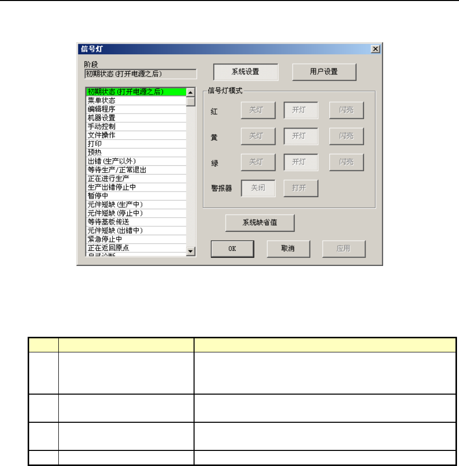 第 2 部 功能详细编 第 6 章 机器设置 6-5-8 信号灯 可设置各画面以及运行时各信号灯的点亮状态。 选择 “ 信号灯”后,显示如下 “ 信号灯”的 设置画面。 图 6-5-8-1 信号灯设置的对话框画面 (1) 设置项目 No. 项目 设置内容 1 系统设置、用户设置 · 系统设置 : 机器固有的设置。 可以参照系统缺省值的 设置参数。 ( 不能修改设置 ) · 用户设置 :可以改变信号灯模式。 2 信号灯模式 ( 红、黄、绿…