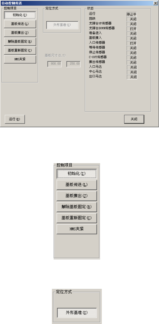 第 2 部 功能详细编 第 7 章 手动控制 7-4-2-2 自动控制传送 从菜单栏中选择 “控制 ( C )” / “传送( C )” / “自动控制传送 ( A) ” , 则显示如下的自动 控制传送画面。 图 7-4-2-2-1 自动控制传送 (1) 控制项目 用按钮来选择控制项目。 图 7-4-2-2- 2 控制项目 (2) 定位方式 定位方式仅限于外形基准。 图 7-4-2-2- 3 定位方式 7- 21