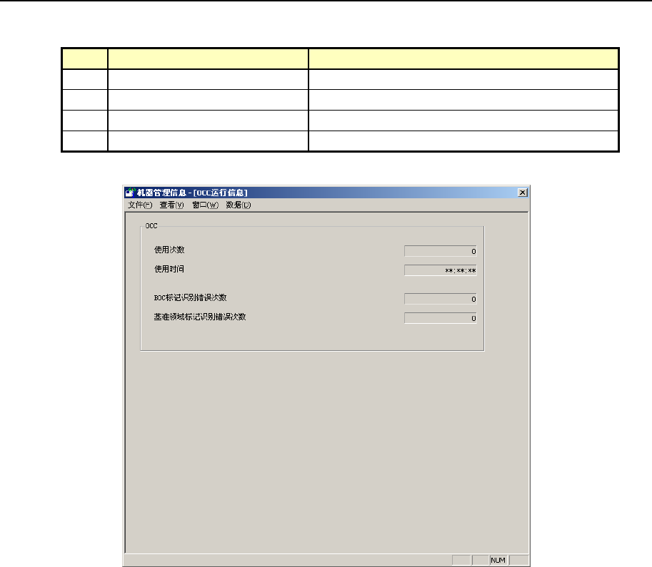 第 2 部 功能详细篇 第 8 章 设备运行信息 8-5-2 OCC 运行信息 从菜单栏中选择“窗口 (W) ” / “图像” / “ OCC 运行信息”,则显示图 8-5-2-1 。 No. 项目 内容 1 使用次数 使用 OCC 的次数累计。 2 使用时间 使用 OCC 的时间累计。 3 B OC 标记识别错误次数 发生 B OC 标记识别错误的次数累计。 4 基准领域标记识别错误次数 发生基准领域标记识别错误的次数累计。 图 8-…