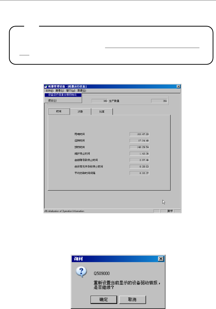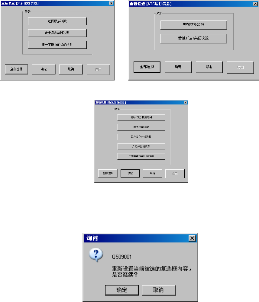 第 2 部 功能详细篇 第 8 章 设备运行信息 图 8-5- 12 -2-7 重新设置异步运 行信息画面 图 8-5- 12 -2- 8 重新设置 ATC 运行信息画面 图 8-5- 12 -2-9 重新设置激光运行信息画面 ● 各种画面里,均有数据项目的选择按钮(复选框型)显示。 选择需要 重新设置的项目,也可以“全部选择”,之后按“确定” 或“应用”按钮,即 可显示如下画面。 图 8-5- 12 -2- 10 询问是否重新设置运行…