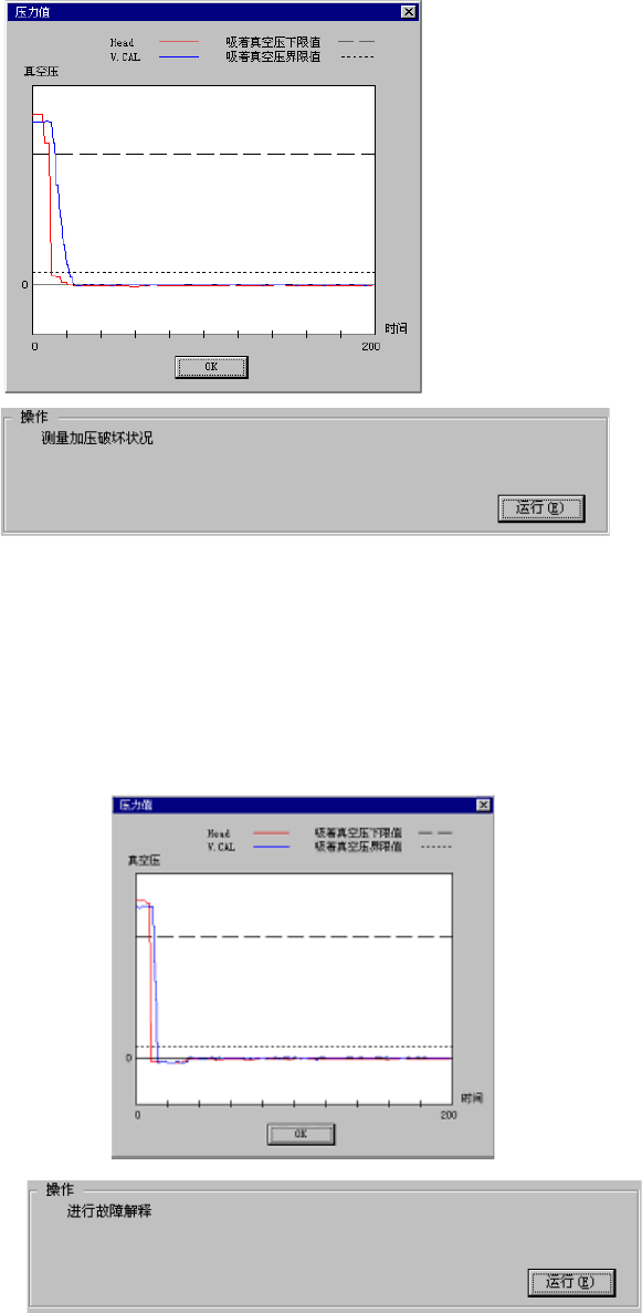 第 2 部 功能详细篇 第 9 章 自动校准 ② 设定 Head 将移动到真空校准上,测量 3 次自然破坏状况。 · 显示第 2 次与第 3 次的平均值。 · 测量后所显示的压力值图表为第 3 次的数据。 请选择“运行”。 选择“运行”,则自动测量加压破坏状况。 ③ 设定 Head 将移动到真空校准上,测量 3 次加压破坏状况。 · 显示第 2 次与第 3 次的平均值。 · 测量后所显示的压力值图表为第 3 次的数据。 …