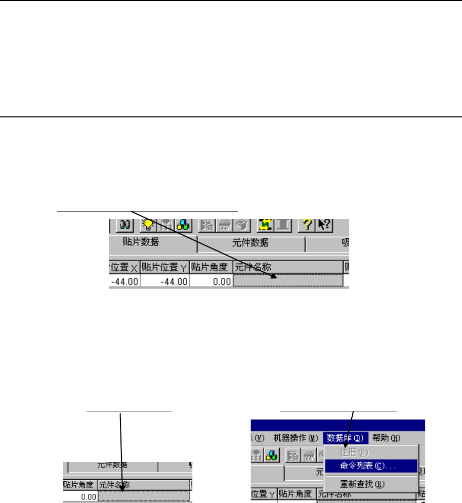 ① 请单击空白的元件名称栏。 ② 请单击“数据库”/“命令列表”。