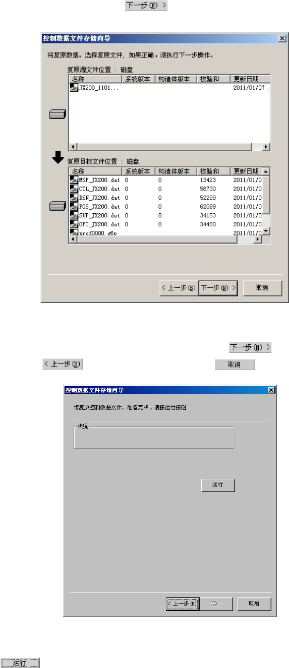 第 2 部 功能详细篇 第 1 3 章 程序补充 指定复原源文件位置后,按下 按钮,则显示如下画面。 ( 下例为将保存复原源文件位置指定为 SSD 时 ) 图 13-2-5- 3 从软盘等复原控制数据文件的画 面 选择复原源文件位置中所显示的可恢复文件后,请按 按钮。要变更操作内容 等时,请按 按钮,或在作业结束时按 按钮。 图 13-2-5- 4 从软盘等恢复控制数据文件的执 行画面 按 按钮来保存控制数据。 13 - 17