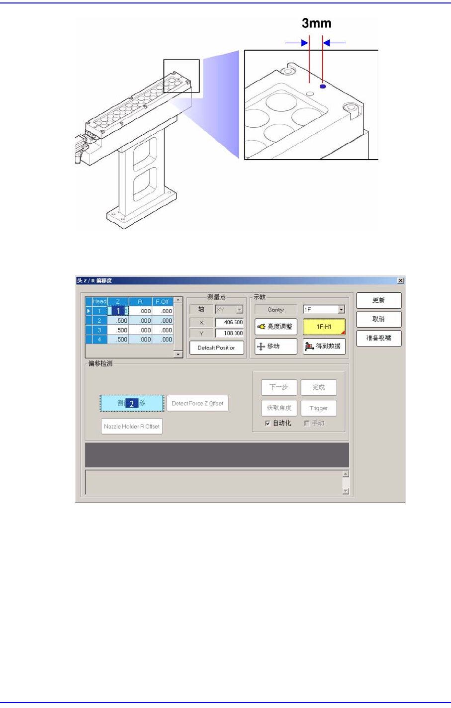 11-27 Machine Calibration 2. 在 <Grid> 领域 中选择执行校正的 Head Z 轴后, 选择 < 自动化 > 校验框, 之后点击 < 测试 Z 偏移 > 按钮。 ( 在这里 任意用 Head 1 设定 ) 3. 那么 HEAD 自动移动到 ANC 上 的指定位置。 然后设备发生空压从 HEAD1 到 HEAD4 依次自动下降轴执行校 正。 4. 完成校正后自动把结果反…