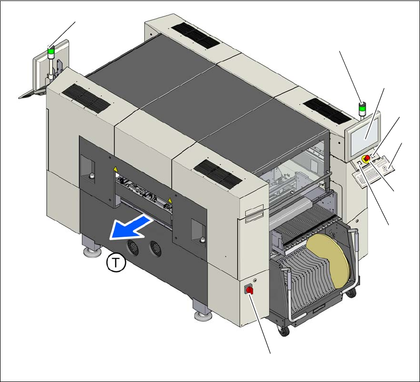 ユーザーマニュアル SIPLACE SX1/ SX2 5 マシンで作業をする ソフトウエアバージョン SC.706.xx 以降 20 12 年 4 月日本語版 5.2 ボタンとスイッチ 223 5.2 ボタンとスイッチ 5.2.1 概要 5 図 5.2 - 1 ボタン、スイ ッチ、表示 5 (1) メインスイッチ (5) 起動ボタン ( 緑 ) (2) 停止ボタン ( 黒 ) (6) LCD タッチスクリーン (3) 非常停止ボタン (…