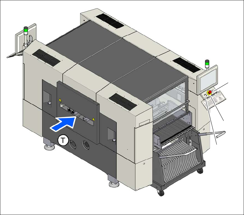 2 運転上の安全 ユーザーマニュアル SIPLACE S X1/SX2 2.7 安全装置 ソフト ウエアバージョン SC.7 06.xx 以降 2012 年 4 月日本語版 66 2.7.2.2 マシンの保護スイッチの位置 2 図 2 .7 - 5 マシンの保護カバースイッチの位置 (1) 保護カバースイッチ、ロケーショ ン 1 (2) 保護カバースイッチ、ロケーショ ン 2 (3) バンパー検出用保護スイッチ (T) PCB 搬送方向…