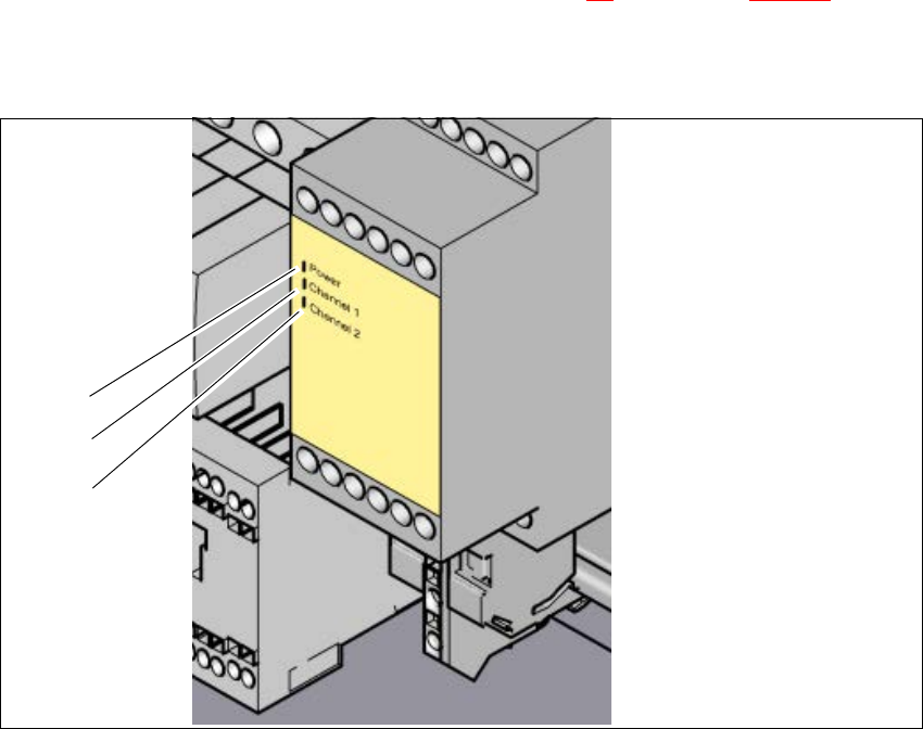 を報せていない場合、チャネル 1 および 2の2個の緑色LEDが、組み合わせ保護コンタクタの