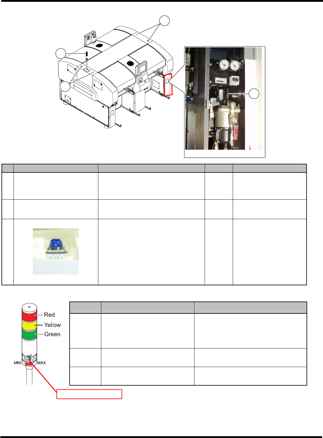 CM602-L 参考手册 1.1 各部的名称和功能 Page 1-4 2. 后视图 No. 装置名称 功能 数量 参照  状况显示灯 (3 段信号塔 ) 显示本机的运转状态, 运转中如果发生异 常, 报警器鸣响报警。 用音 量调节钮调节 报警器的音量。 1 下述  调节器旋钮 ( 盖内侧 ) 调整供给气压。 1 操作手册  工作台显示灯 EJM4A -019P 出现部品用完或者故障 的工作台的显 示 灯闪烁。 自动运转中 ·灭灯 …