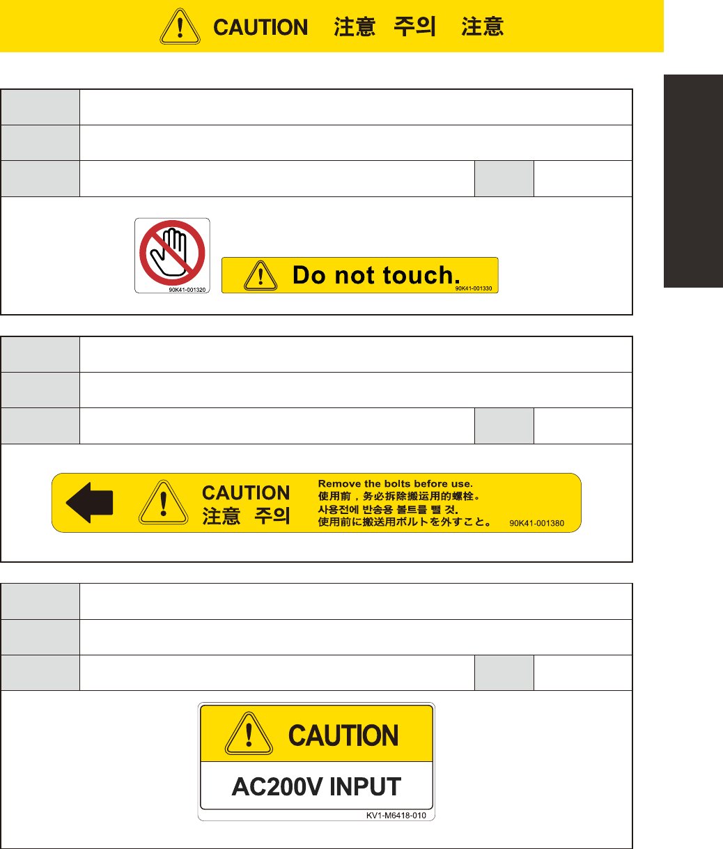 xviii Safety instructions Potential hazard Electrical shock T o avoid hazard Keep the ionizer away from eyes. Do not disassemble or touch the discharge needles. Applicable machines Machines equipped with ionizer (option)…