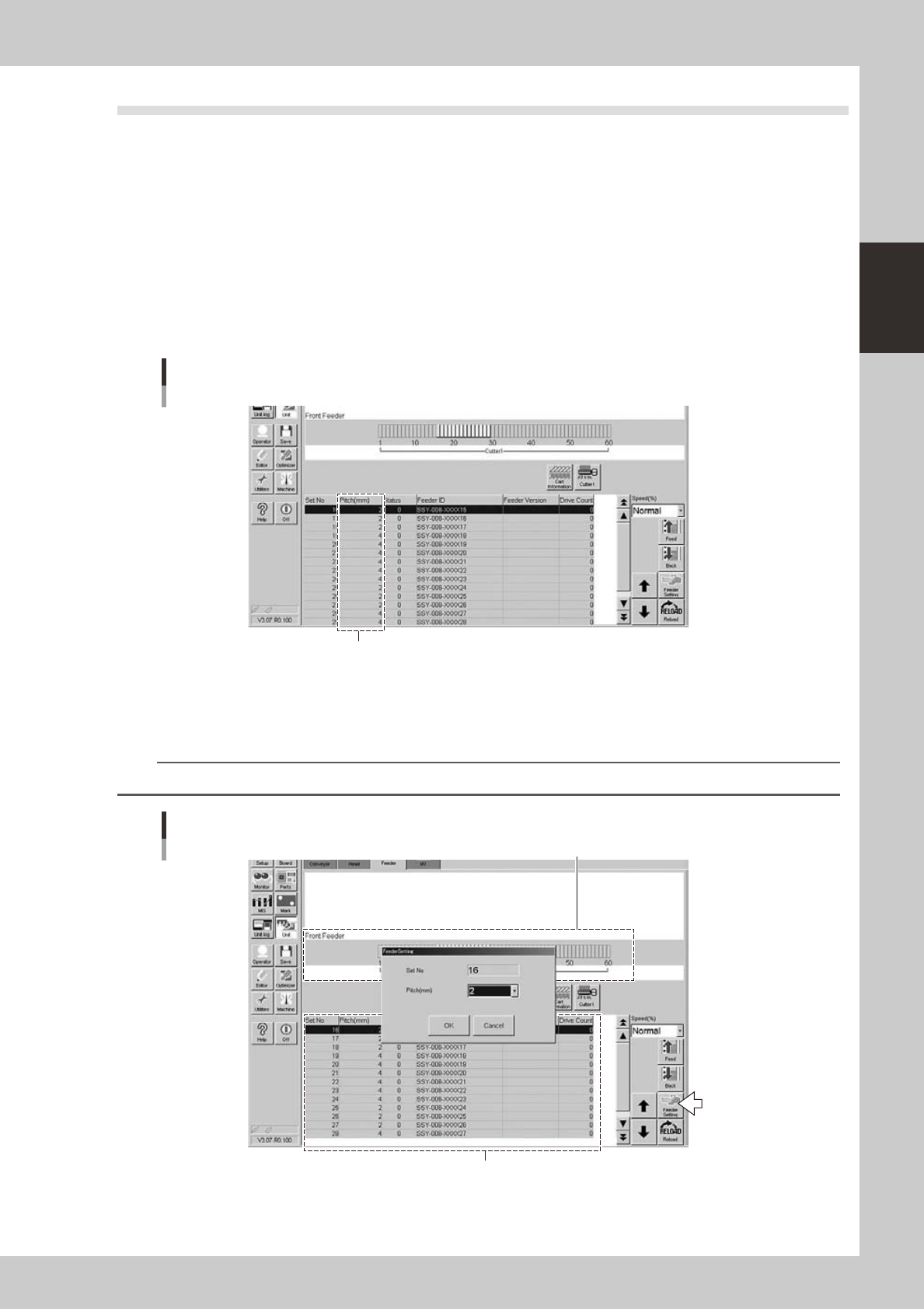 The following sections explain the procedures for pitch setting when "Reference of feeder pitch" was set to
