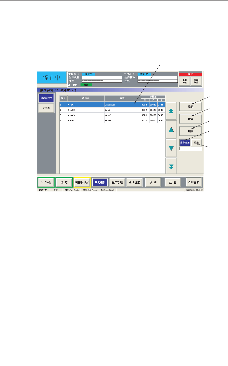 3 - 49 0505-003 2. 2. 2. 2. 2. 线路板程序的编辑 线路板程序的编辑 线路板程序的编辑 线路板程序的编辑 线路板程序的编辑 2. 2. 2. 2. 2. 线路板程序的编辑 线路板程序的编辑 线路板程序的编辑 线路板程序的编辑 线路板程序的编辑 2. 1 2. 1 2. 1 2. 1 2. 1 “ 线路板程序 线路板程序 线路板程序 线路板程序 线路板程序 ” 界面 界面 界面 界面 界面 按主菜单栏的 [ 编…