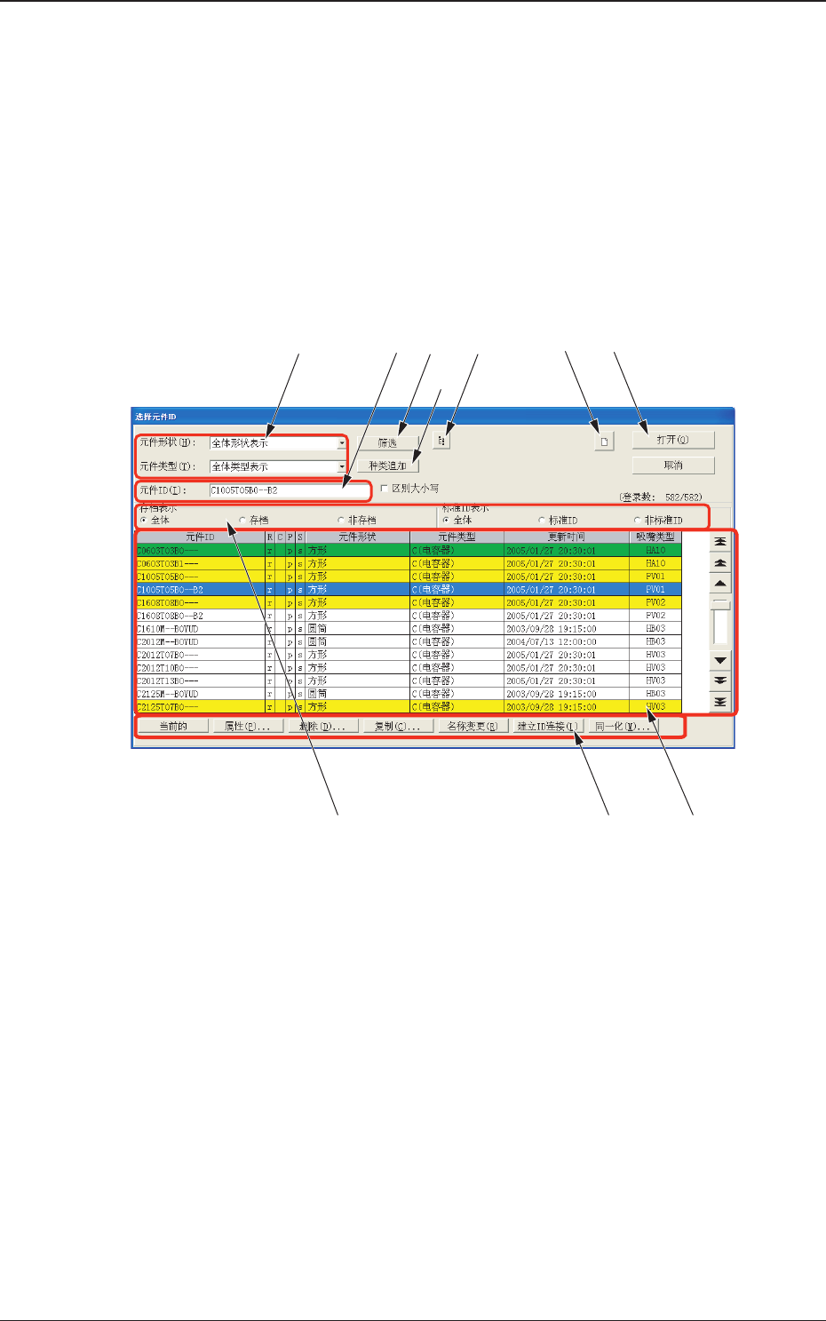 [1]元件 ID 一览中显示符合选中元件形状及元件类型的元