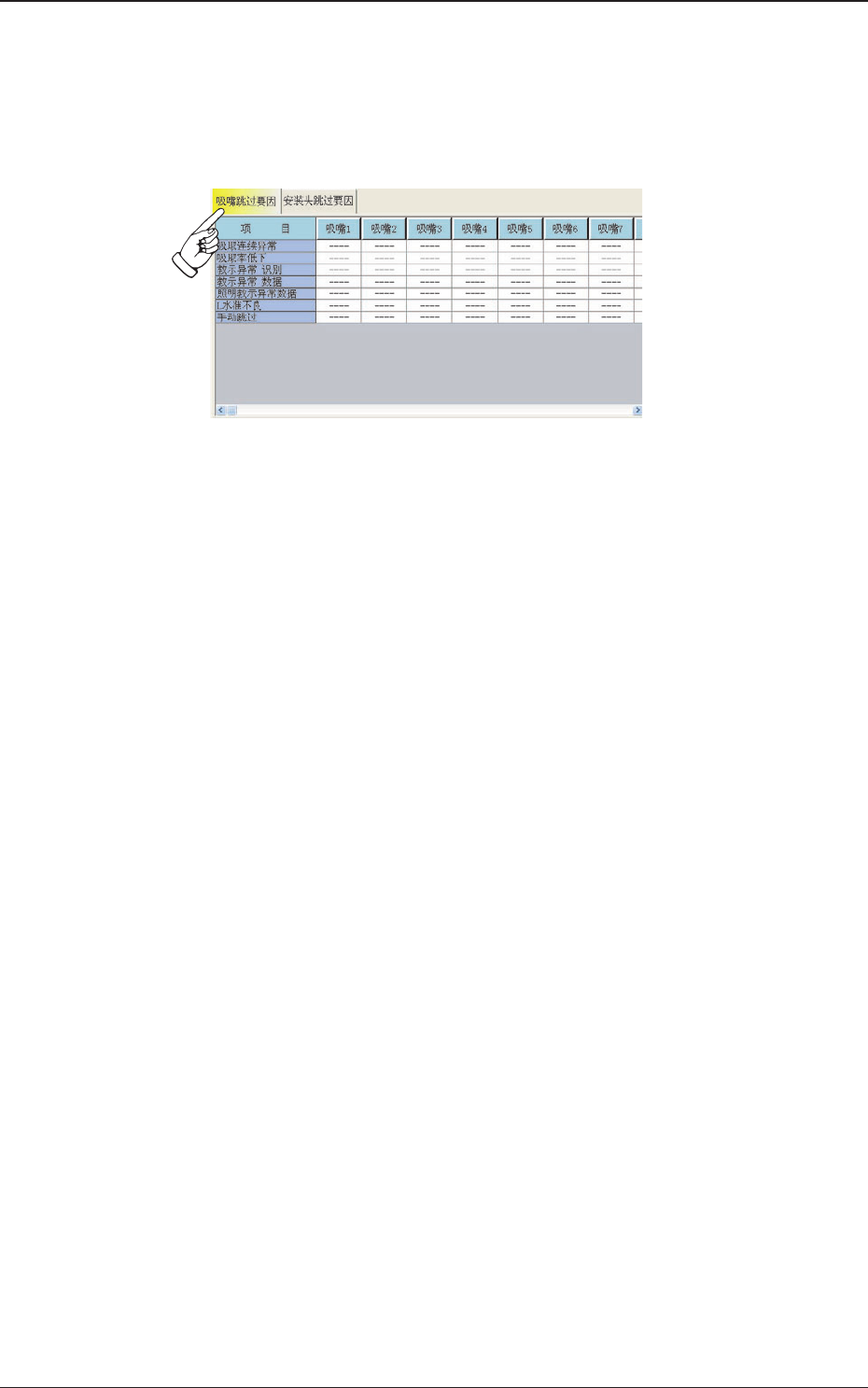 4.2 4.2 4.2 4.2 4.2 吸嘴跳过要因 吸嘴跳过要因 吸嘴跳过要因 吸嘴跳过要因 吸嘴跳过要因 在 “ 安装头及吸嘴的跳过情报 ” 界面中,按 [ 吸嘴跳过要因 ]Tab , 显示以下选项卡。 Fig.3E 1 8 Fig.3E 1 8 Fig.3E 1 8 Fig.3E 1 8 Fig.3E 1 8 “ 吸嘴跳过要因 吸嘴跳过要因 吸嘴跳过要因 吸嘴跳过要因 吸嘴跳过要因 ” 选项卡 选项卡 选项卡 选项卡 选项卡 ( …