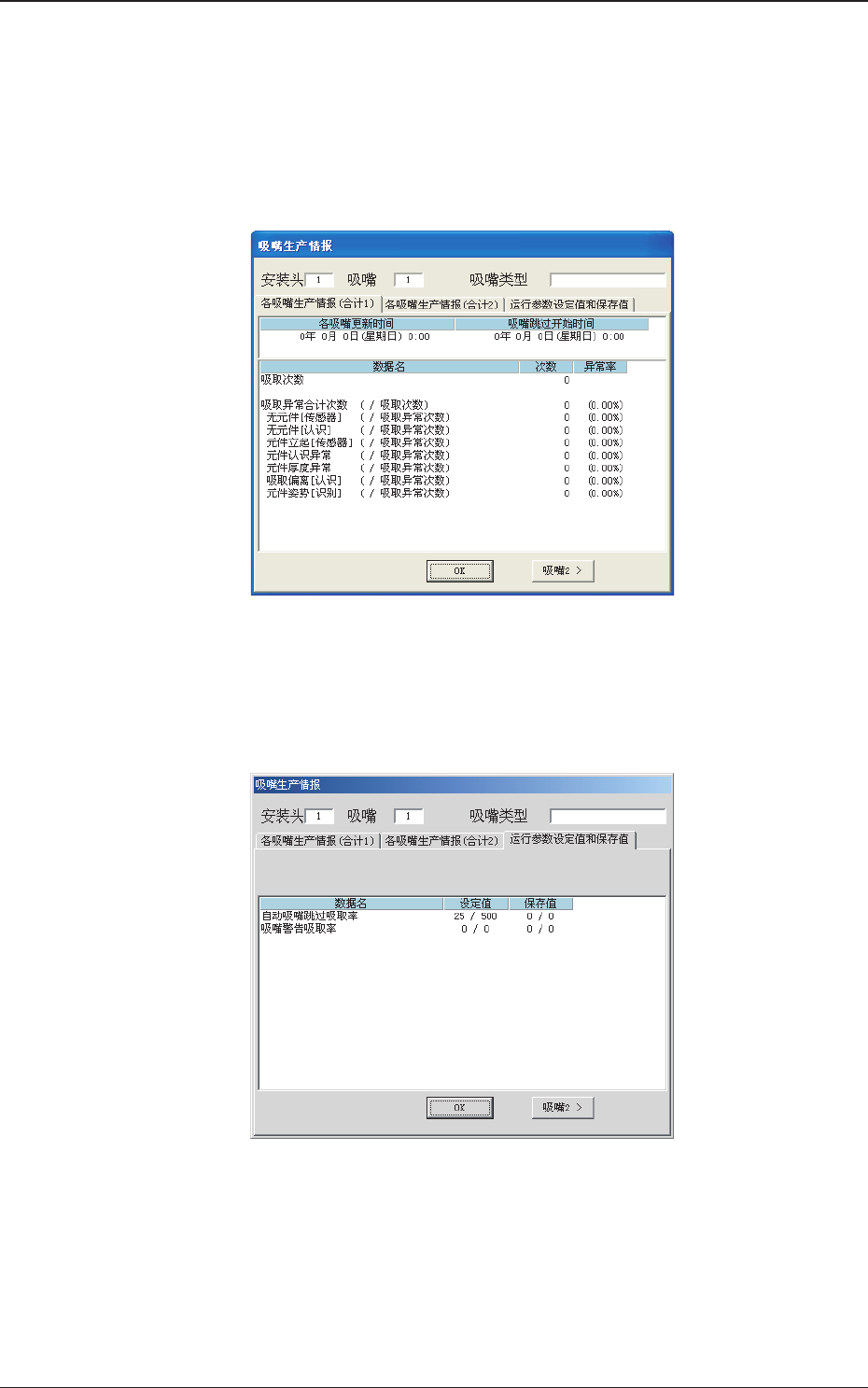 跳过及吸取率情报 界面中,按[ 安装头及吸嘴的跳过情报]