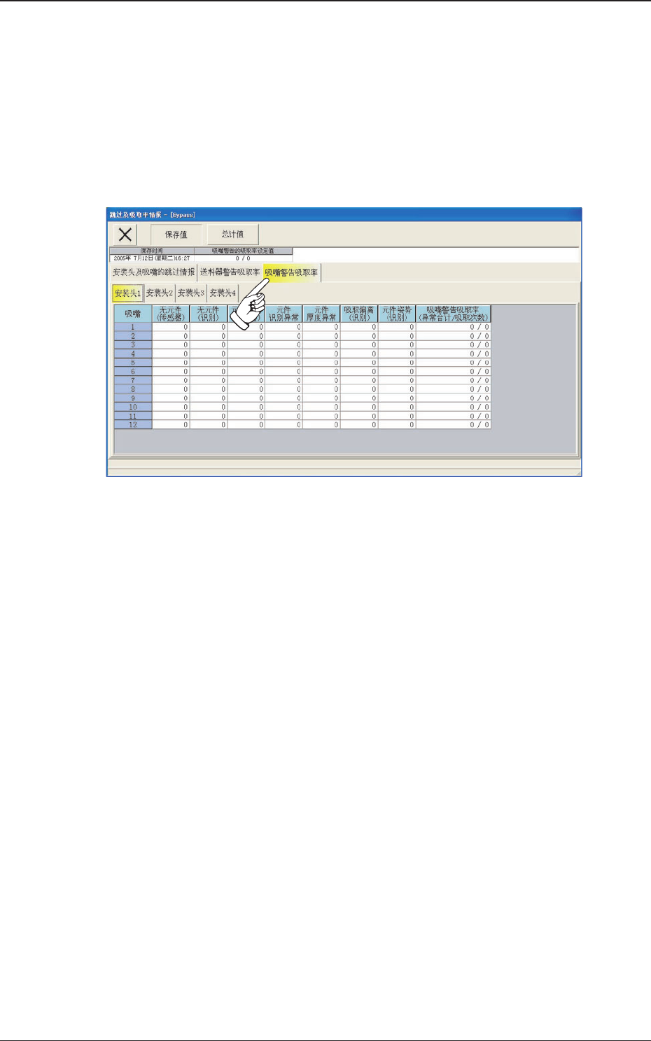 在 “ 跳过及吸取率情报 ” 界面中,按[ 吸嘴警告吸取率]Tab,显示