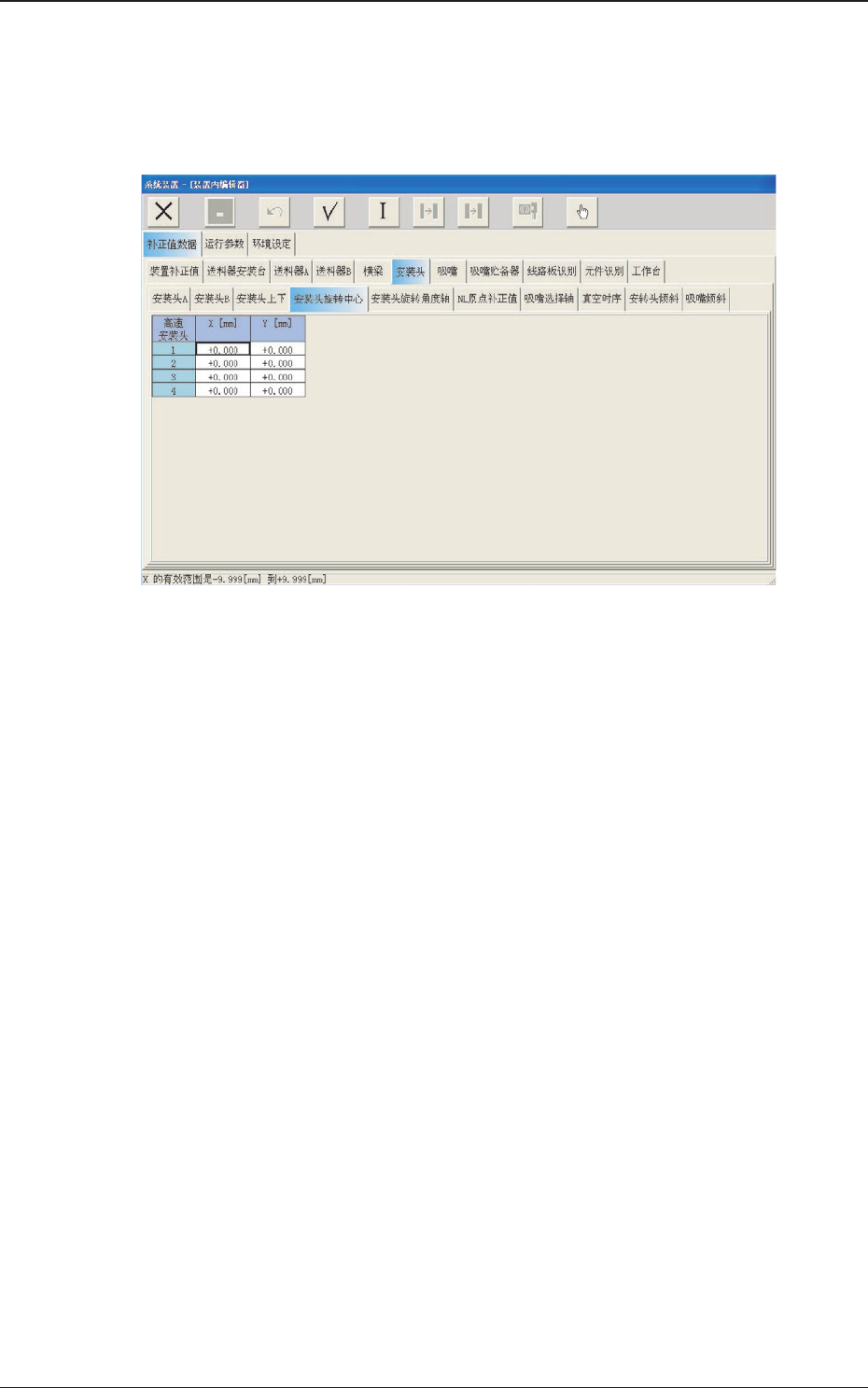 6 - 24 2.1 2.1 2.1 2.1 2.1 补正值数据 补正值数据 补正值数据 补正值数据 补正值数据 0505-003 安装头 安装头 安装头 安装头 安装头 1 1 1 1 1 、 、 、 、 、 2 2 2 2 2 、 、 、 、 、 3 3 3 3 3 、 、 、 、 、 4 4 4 4 4 X X X X X 、 、 、 、 、 Y[mm] Y[mm] Y[mm] Y[mm] Y[mm] 调整安装头旋转中心和线路板识…