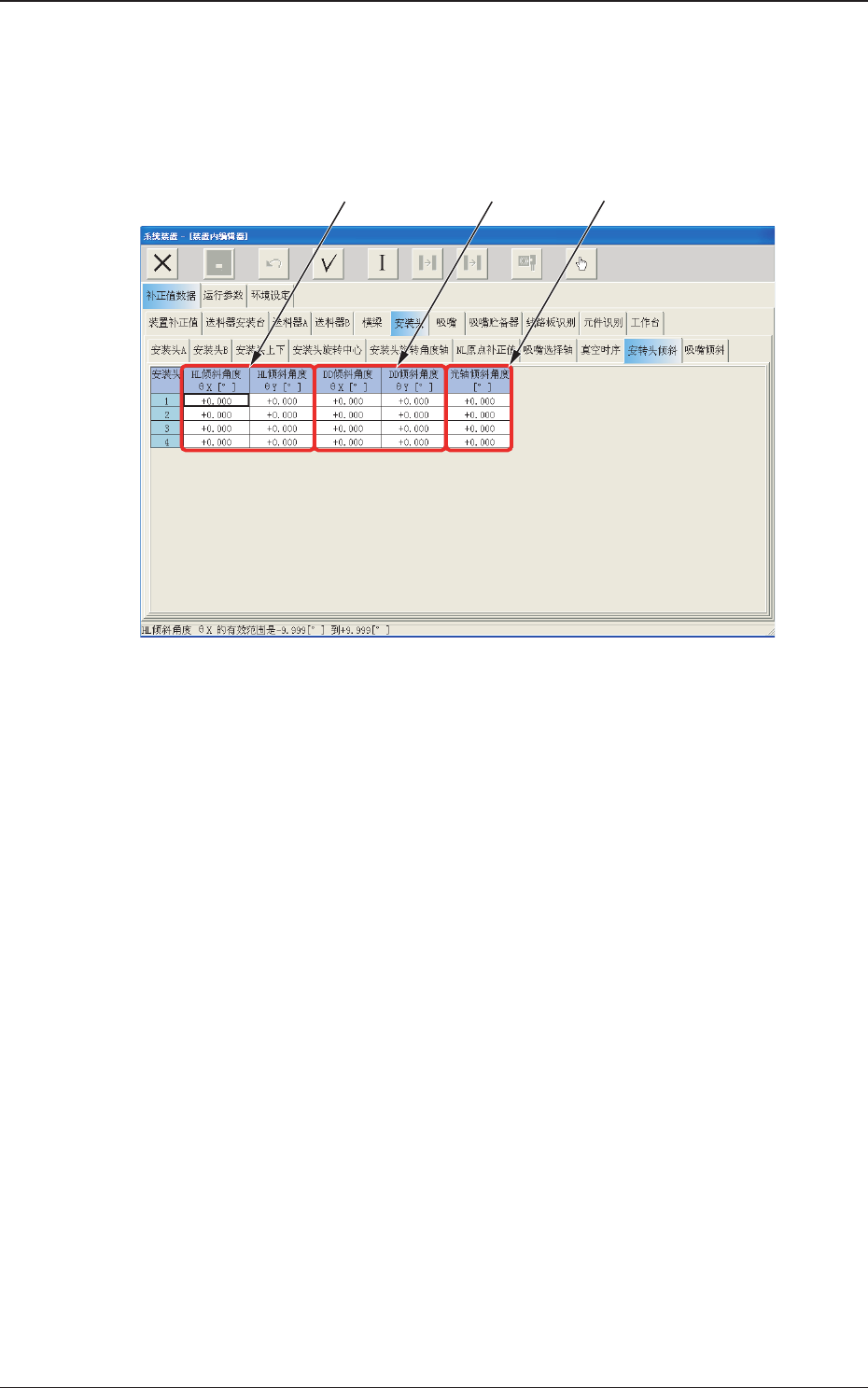 6 - 32 2.1 2.1 2.1 2.1 2.1 补正值数据 补正值数据 补正值数据 补正值数据 补正值数据 0505-003 2.1.13 2.1.13 2.1.13 2.1.13 2.1.13 安装头倾斜补正值 安装头倾斜补正值 安装头倾斜补正值 安装头倾斜补正值 安装头倾斜补正值 在 “ 补正值数据 ” 选项卡中,按 [ 安装头 ]Tab ,再按 [ 安装头倾斜 ] Tab ,显示以下选项卡。 Fig.3F25-2 Fig.3…