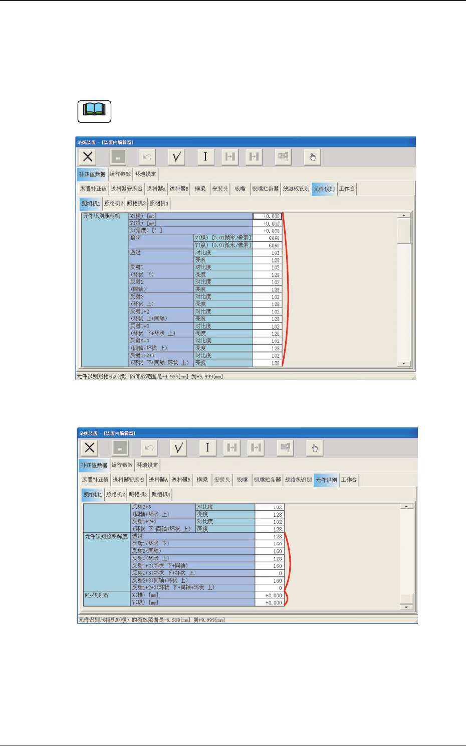 6 - 45 2.1 2.1 2.1 2.1 2.1 补正值数据 补正值数据 补正值数据 补正值数据 补正值数据 0505-002 2.1.22 2.1.22 2.1.22 2.1.22 2.1.22 元件识别补正值 元件识别补正值 元件识别补正值 元件识别补正值 元件识别补正值 在 “ 补正值数据 ” 选项卡中,按 [ 元件识别 ]Tab ,再按 [ 照相机 1] Tab ,显示以下选项卡。 [ 照相机 2] 到 [ 照相机 4] 也…