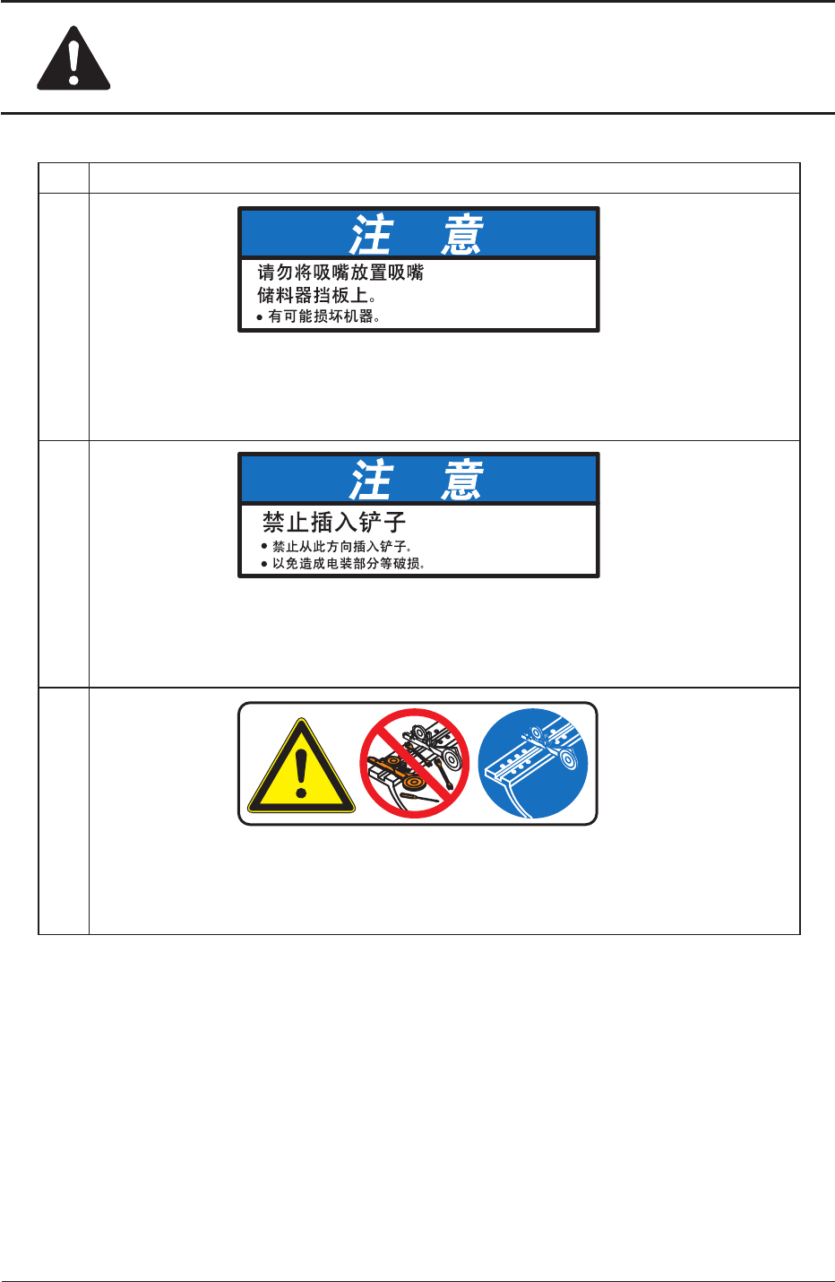 安全 - 30 No. 警告标签及其说明 (27) 说 明  请正确安装吸嘴到吸嘴储料器上。 若将吸嘴放置到吸嘴储料器挡板上进行运转,就有可能损坏机器。 (28) 说 明  运送装置时,请从装置正面或装置背面插入叉子或叉板。 从装置侧面插入,有可能破损电器设备部。 (29) 说 明  请勿在送料器安装台上横放送料器或工具等。 否则会成为装置故障的原因。 0602 - 003 为了使用上的安全起见