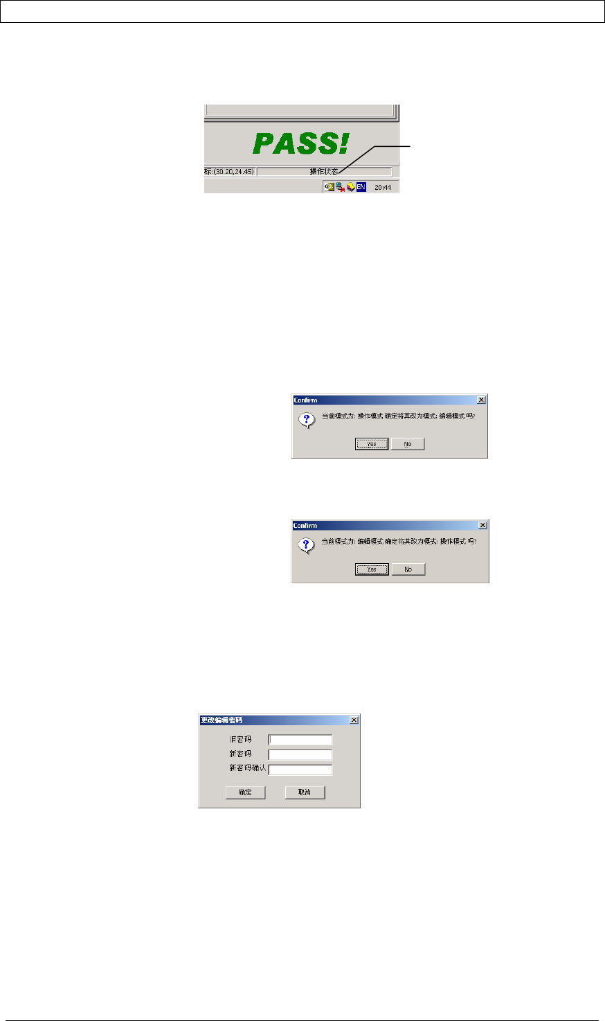 第一章 开始操作前 | 11 1.6 操作状态和编辑状态 AOI 系统分为两种状态:操作状态和编辑状态,状态显示在屏幕的右下角,如下图。 1. 操作状态: 在此状态下,不可以编辑数据,不可以保存或装载程序,只有基本操作功能, 适合程序已经调试稳定后由测试操作人员使用。系统启动后自动进入操作状态。 2. 编辑状态: 在此状态下 , 可以使用软件所有功能 , 适用于技术人员编程和调试。 1.6.1 改变状态 如需要在编辑状态和操作状态之间切…